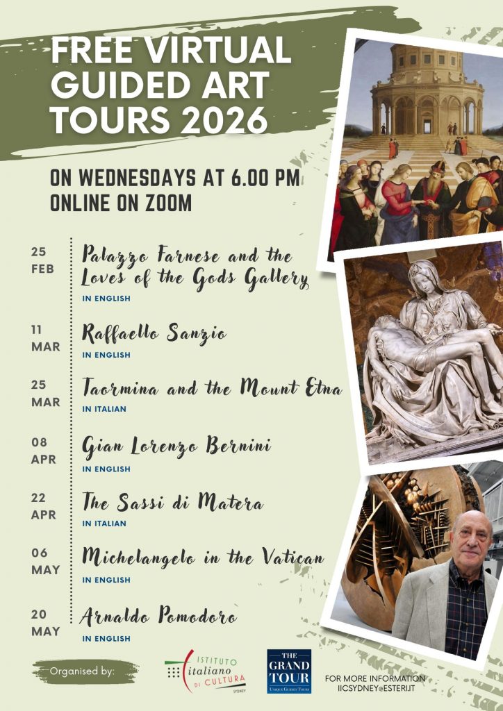 The Italian Cultural Institute of Sydney, in collaboration with The Grand Tour, is pleased to present a series of FREE virtual guided tours on Zoom, every other Wednesday from 25th of February till the 20th of May 2026